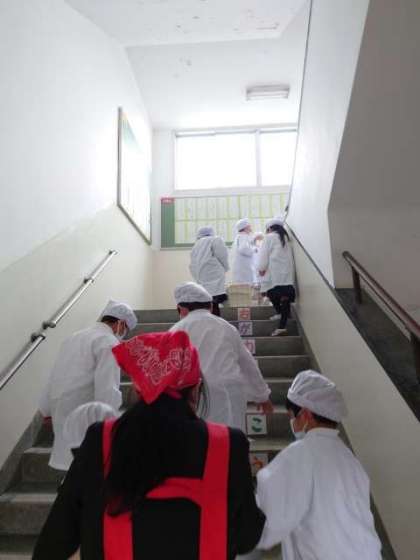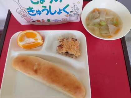 今日のメニューは、押し麦のグラタン、豚肉と野菜のスープ、いよかんです。