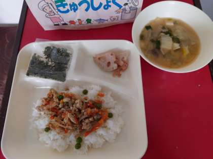 今日のメニューは、鶏ごぼうご飯、豆腐の味噌汁、焼きレンコンのやや食物繊維重視メニューです。