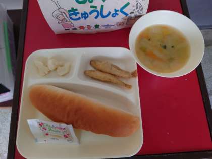 今日のメニューは、わかさぎフライ、コーンとはくさいのスープ、カリフラワーのサラダです。