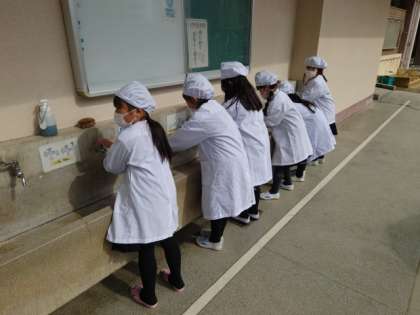 水は冷たいですが、給食当番の1年生は、とてもていねいに手を洗っていました。