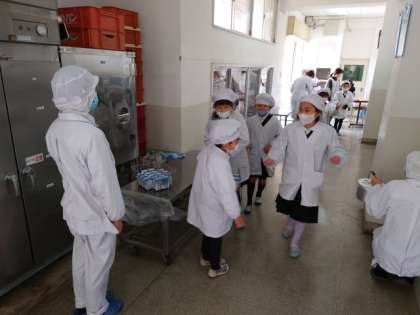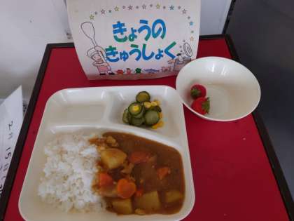 今日のメニューは、チキンレバーカレーライス、きゅうりとコーンのサラダ、いちごです。