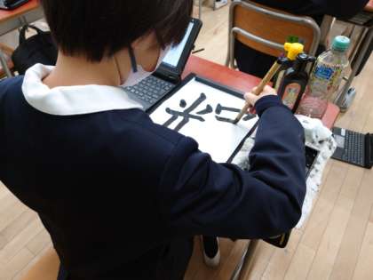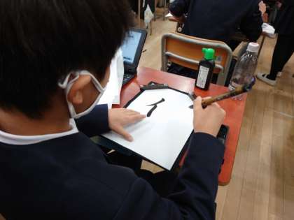 書写の時間に、6年間の成長を一文字で表して書きました。
