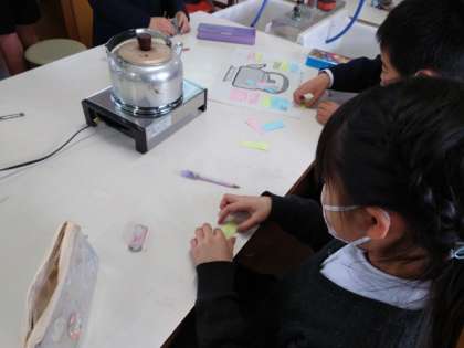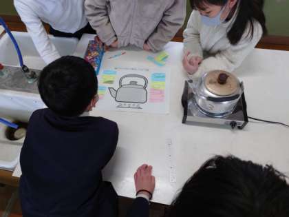 見た目や、音、やかんの中の水の変化など、それぞれで気づいたことを色分けしたふせんに書き、みんなで交流しながら特徴をまとめました。