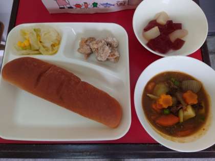 今日のメニューは、フライドチキン、カレーシチュー、キャベツとコーンのサラダ、フルーツゼリーです。
