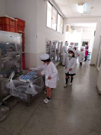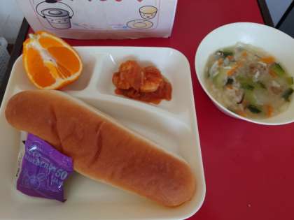 今日のメニューは、えびのチリソースいため、中華がゆ、デコポンです。