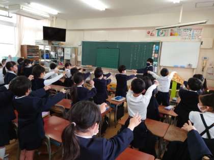 今年度最後の体育朝会は、教室での握力体操です。
