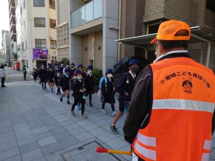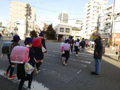 今日は中学校が卒業式なので、いつもより通学路が空いていますが、きちんと並んで行儀よく歩く姿が見られました。