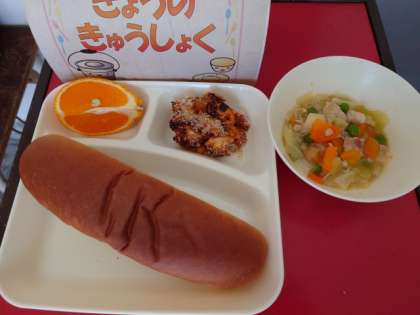 今日のメニューは、とうふのミートグラタン、おし麦と野菜のスープ煮、デコポンです。