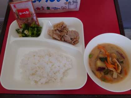 今日のメニューは、豚肉のしょうが焼き、さつまいものみそ汁、なの花のおひたしです。