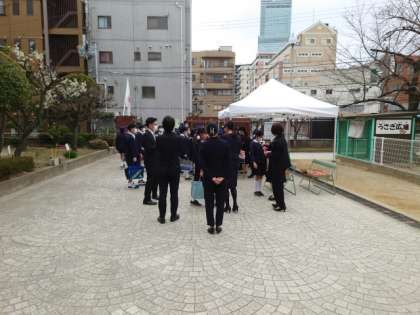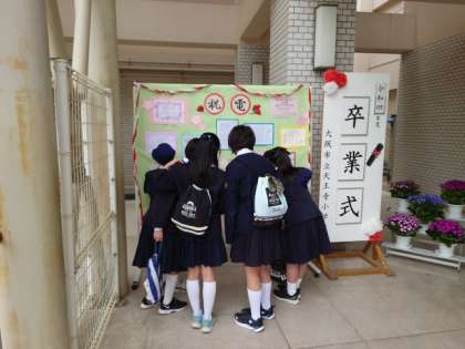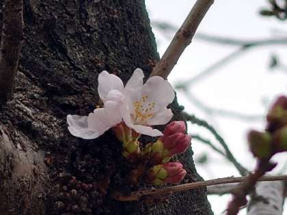 卒業生の門出を祝うように学校の桜が今朝開花しました。