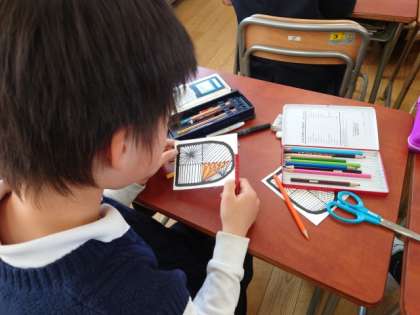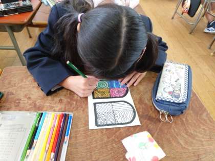 ゼンタングラム風の模様を描いて、ていねいに色をぬっていきます。