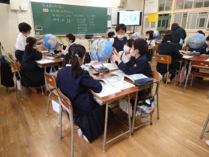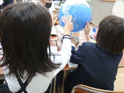 赤道や緯度・経度、六大陸などたくさんの言葉が出てきますが、みんなしっかり聞きながら、地球儀を使って確認していました。