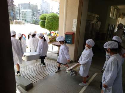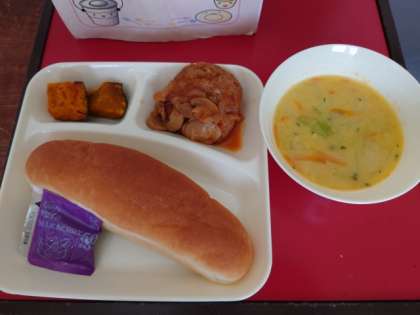 今日のメニューは、煮込みハンバーグ、キャベツとコーンのスープ、焼きカボチャです。