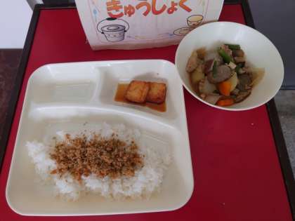 今日のメニューは鶏肉とじゃがいもの煮物、厚揚げのしょうゆだれかけ、鮭そぼろです。