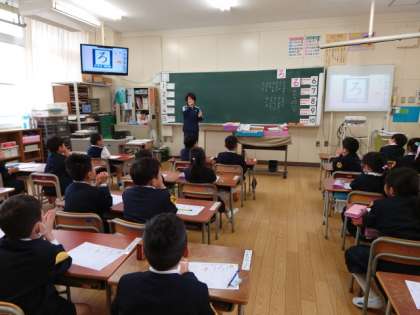 書く前に、語感を養うために、手拍子など体の動きを取り入れて言いました。