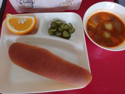 今日のメニューは、ビーフシチュー、きゅうりのサラダ、あまなつかんです。