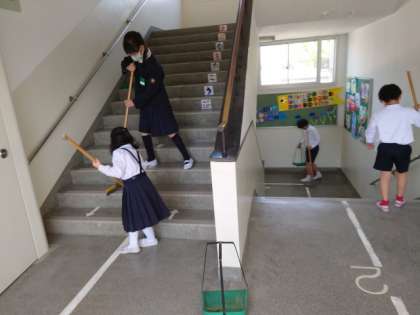 天王寺小学校では、自分の教室以外をたて割りで清掃しています。