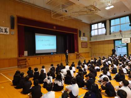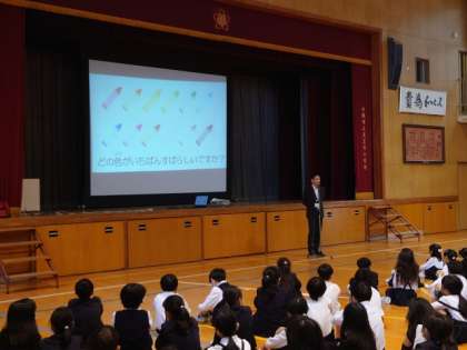 そして「どの色もそれぞれ違うのですから、どれが一番すばらしいかなんて決められませんし、どの色も必要な、大切な色なのです。学級に置き換えてみると、クレヨンはみなさん自身です。いじめは、そうした違いを認められないから起こるのだと思います。」と話しました。