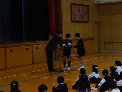 また、今日の児童朝会では、サッカーチームで優秀な成績を収めた児童を表彰しました。