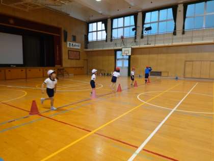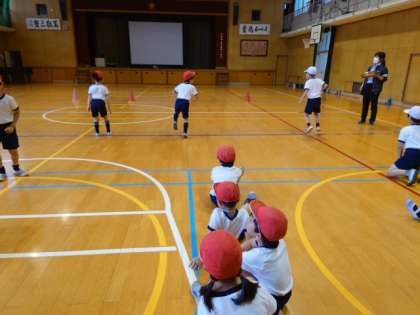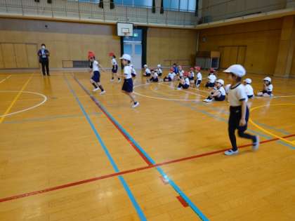 体つくりの運動遊びで、リズムに合わせて自分で考えたいろいろなステップをしました。