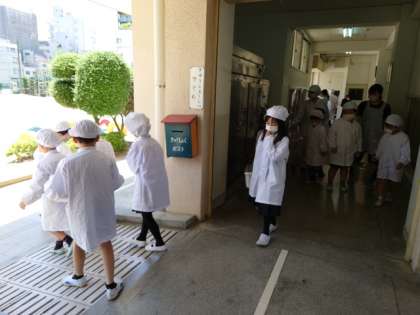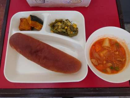 今日のメニューは、ケチャップ煮、さんどまめとコーンのソテー、焼きカボチャの甘みつかけ です。