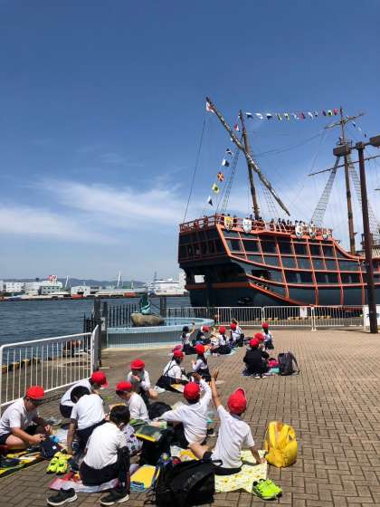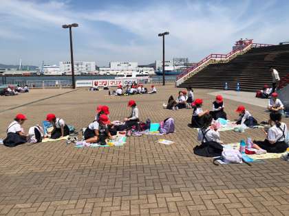 見学が終わると、船の見える港でお弁当を食べました。