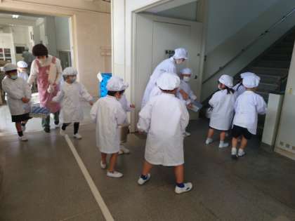 先週から1年生も自分たちで給食を運び始めました。