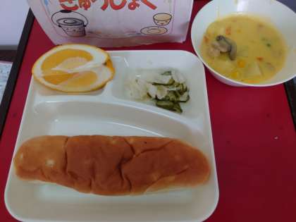 今日のメニューは、コーンクリームシチュー、キャベツときゅうりのサラダ、かわちばんかん です。