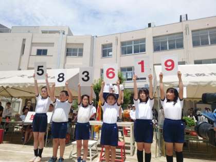 今年の運動会の得点は、赤組619点、白組583点で、赤組が2連覇達成です。