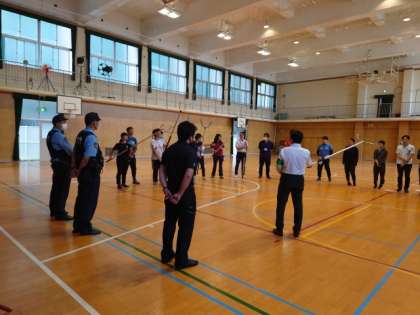 さらに休み時間には、教職員がさすまたの使い方を教えていただきました。