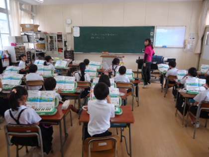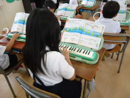 【2組】音楽の時間にけんばんハーモニカで、「かえるのがっしょう」の歌を輪唱で弾きました。
