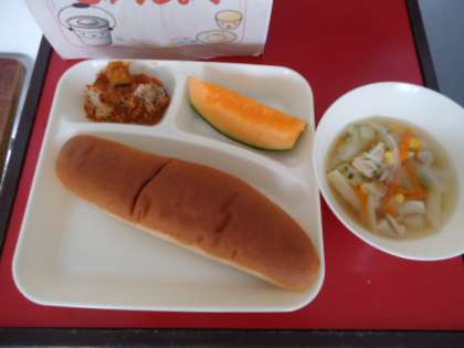 今日のメニューは、かぼちゃのミートグラタン、鶏肉と野菜のスープ、クインシーメロン です。