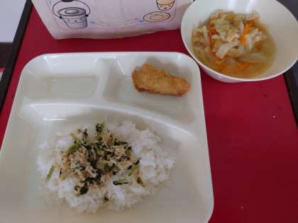 今日のメニューは、白身魚フリッター、すまし汁、とり菜っ葉いため です。
