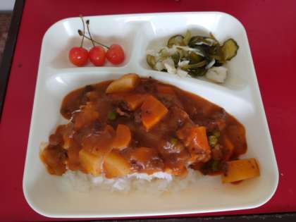 今日のメニューは、ハヤシライス、ミックス海藻のサラダ、さくらんぼ です。