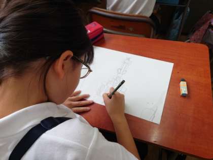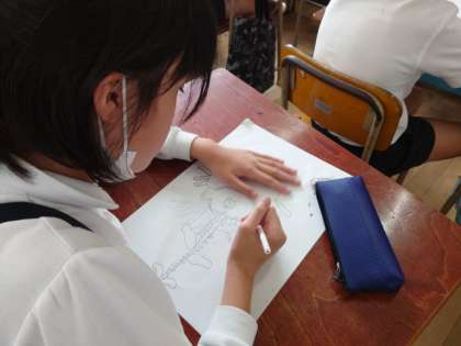 【2組】図画工作科で、見たことがないような不思議な花を想像して描きます。