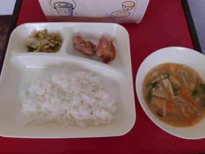 今日のメニューは、鶏肉の醤油バター焼き、みそ汁、野菜いため です。