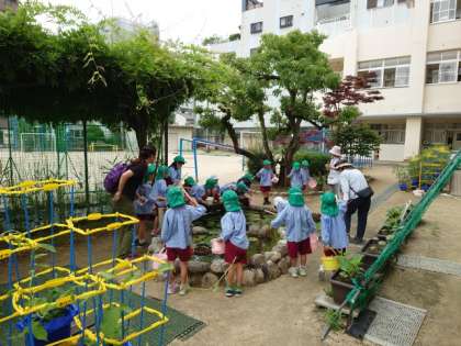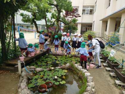 幼少連携で大江幼稚園の年長さんが学校に来て、ザリガニつりで遊びました。