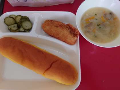 今日のメニューは、サーモンフライ、豆乳スープ、きゅうりのバジル風サラダ です。