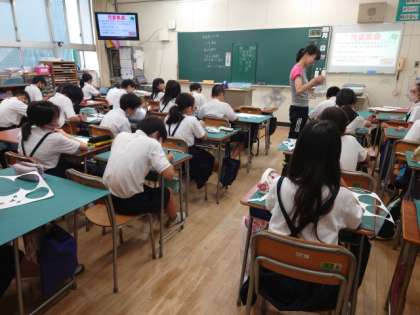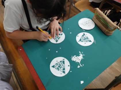 【2組】円と三角形を組み合わせた幾何学模様の中にデザインをして切り抜き、組み合わせて立体造形作品を作ります。