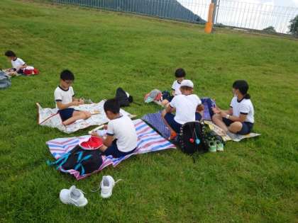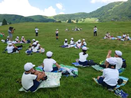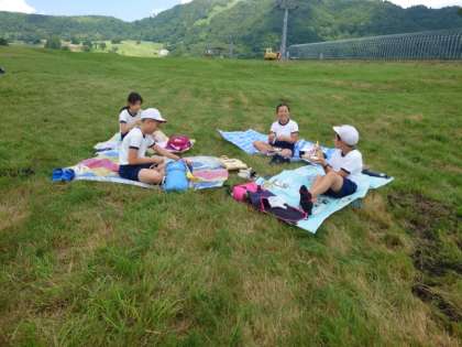 高原でお昼ご飯のお弁当を食べています。