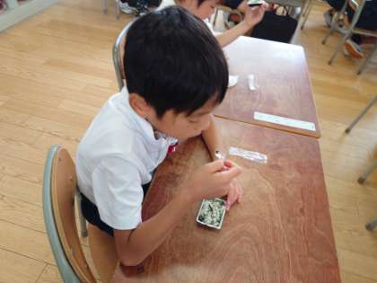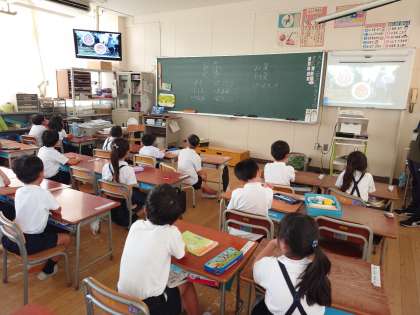 1年生は、防災のビデオを見たり、アルファ化米を試食したりしました。