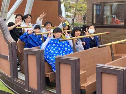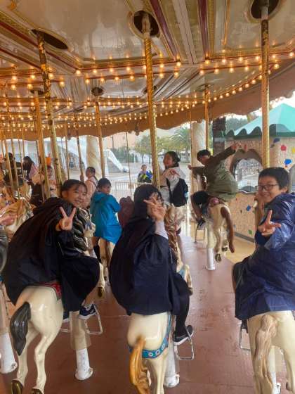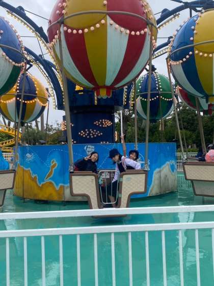時折小雨が降っていますが、動いているアトラクションを見つけて乗っています。