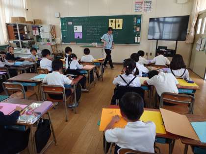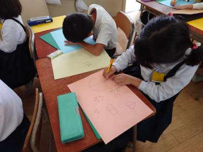 【1組】カッターナイフでクラフト用紙を切って窓を作りました。