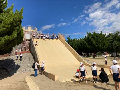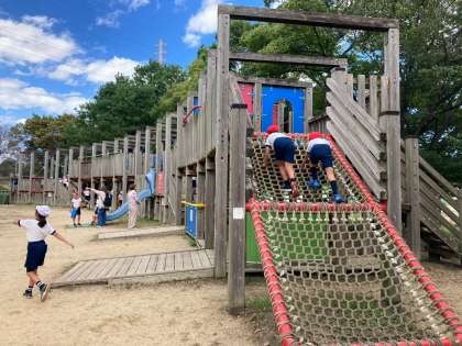 少し雨に降られて雨宿りをしましたが、しばらくすると晴れ間が広がってきたので、遊具で遊ぶことができました。