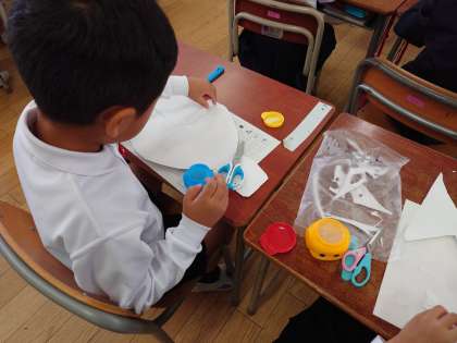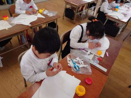 はさみを上手に使って切り抜いた小さなパーツを、のりを使って上手に貼り付けていました。