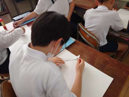 紙でできた簡易コンパスを使って円を描き、その特徴を調べました。