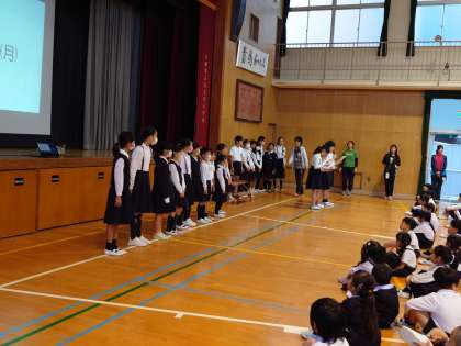 続いて、給食献立コンクールの入賞者の表彰式と、天王寺区主催「わたしたちのまちの未来」絵画コンクールに入選した児童の表彰をしました。
