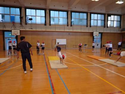 6年生は、マット運動の側方倒立回転とロンダートに挑戦しました。
