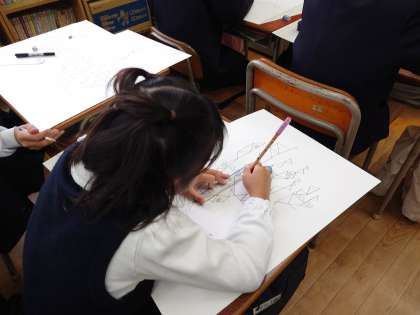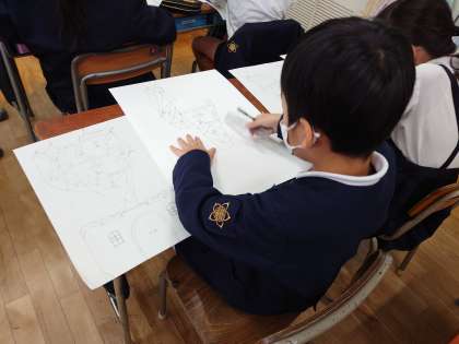 【1組】図画工作科で三角形を使ったお城を描きました。