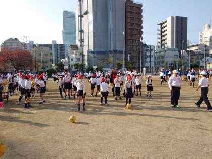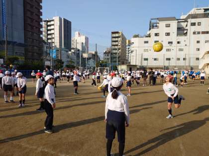 今月は行事や天候の関係でなかなかできなかった体育朝会ですが、今朝はボール運動をしました。